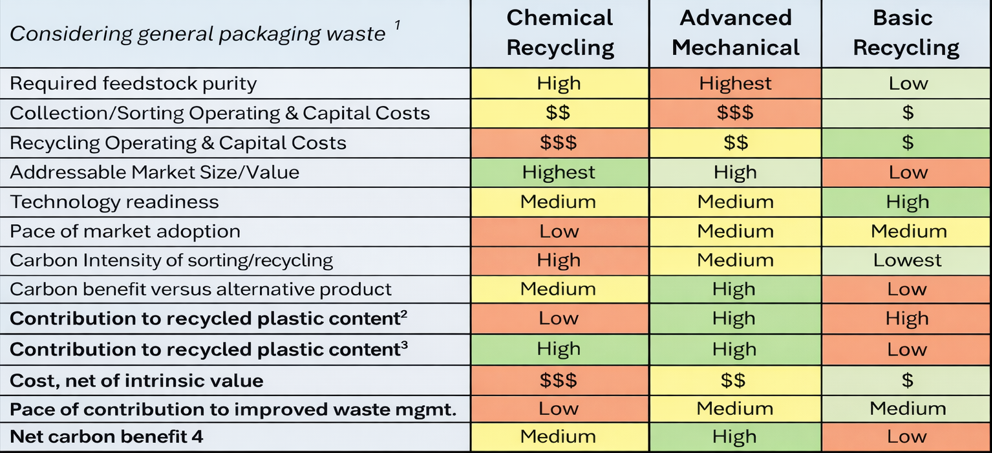 No single technology satisfies all objectives. Chemical recycling enables high-quality closed-loop applications but at higher cost and lower carbon benefit. Advanced mechanical recycling delivers strong environmental performance but depends on highly controlled feedstocks. Basic recycling offers accessibility and resilience but limited circularity. All three are therefore required simultaneously within an effective circular system, with deployment shaped by regional policy priorities, infrastructure maturity, and historical practices.